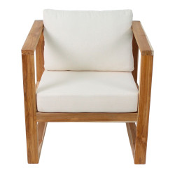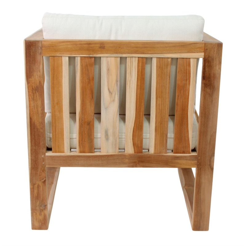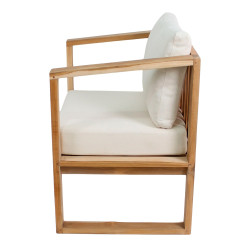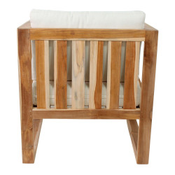 The Bor Wooden Armchair with Cushions fuses rustic elegance and contemporary comfort. Its solid teak wood structure, known for its durability and resistance, guarantees a long useful life. The rustic design is enhanced by the exquisite cushions upholstered in a soft textile, offering a seat and backrest of great comfort. The combination of natural wood and the neutral tones of the textile creates a piece that integrates perfectly into any space, whether indoors or covered outdoors. This armchair is not only a symbol of artisanal quality, but also an invitation to relax and enjoy quiet moments with a touch of rustic charm.