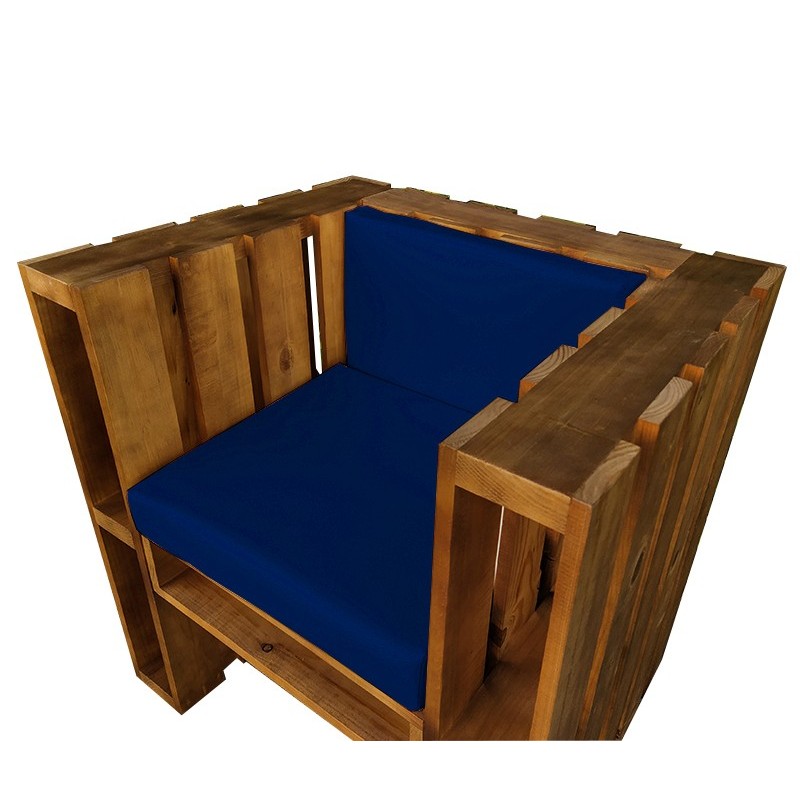 Pallet style armchair with arms and magazine racks for storing small objects such as glasses or smartphones.