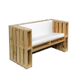 Pallet style armchair with arms and magazine racks for storing small objects such as glasses or smartphones.