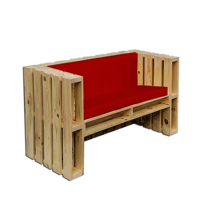 Pallet style armchair with arms and magazine racks for storing small objects such as glasses or smartphones.