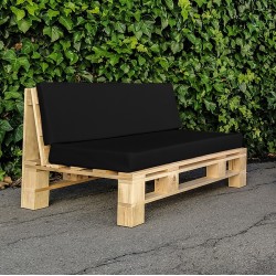 Pallet sofa made of brushed and sanded pine wood, inclined backrest for greater comfort and convenience, possibility of multiple combinations of wood and textile finishes.