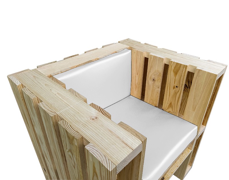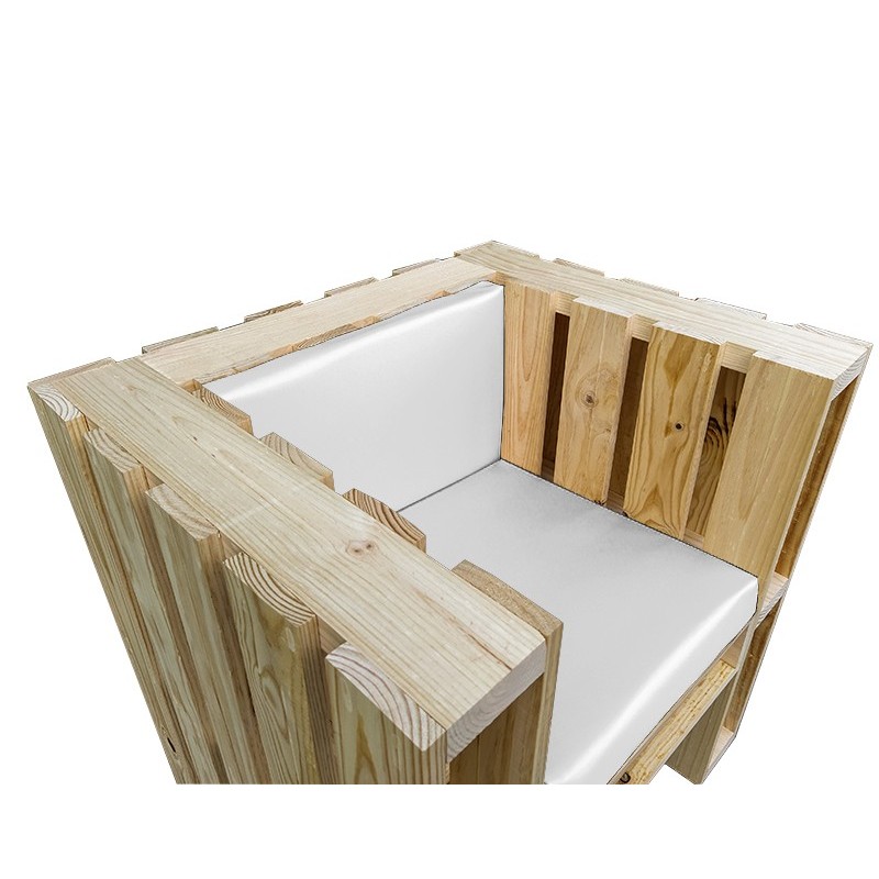 Tratamiento protector lasur color nogal o natural, colchonetas en polipiel náutico apto para su uso en ambientes interiores o exteriores.