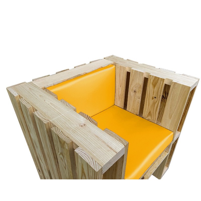 Sillón estilo palet con brazos y huecos revisteros para almacenamiento de pequeños objetos tales como vasos o smartphones.