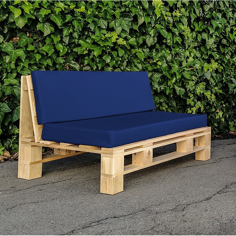 Sofa palet fabricado en madera de pino cepillada y lijada, respaldo inclinado para mayor confort y comodidad, posibilidad de multipes combinaciones de acabados en madera y textiles.
