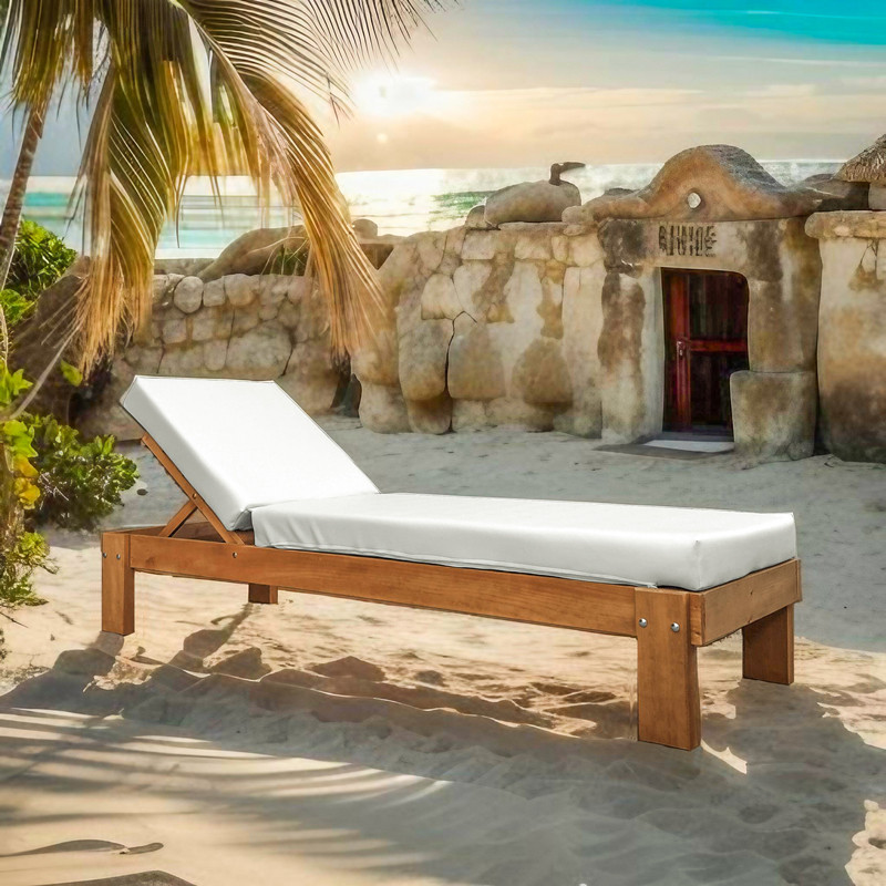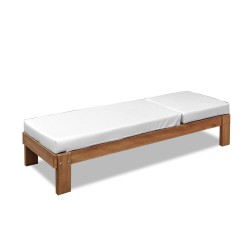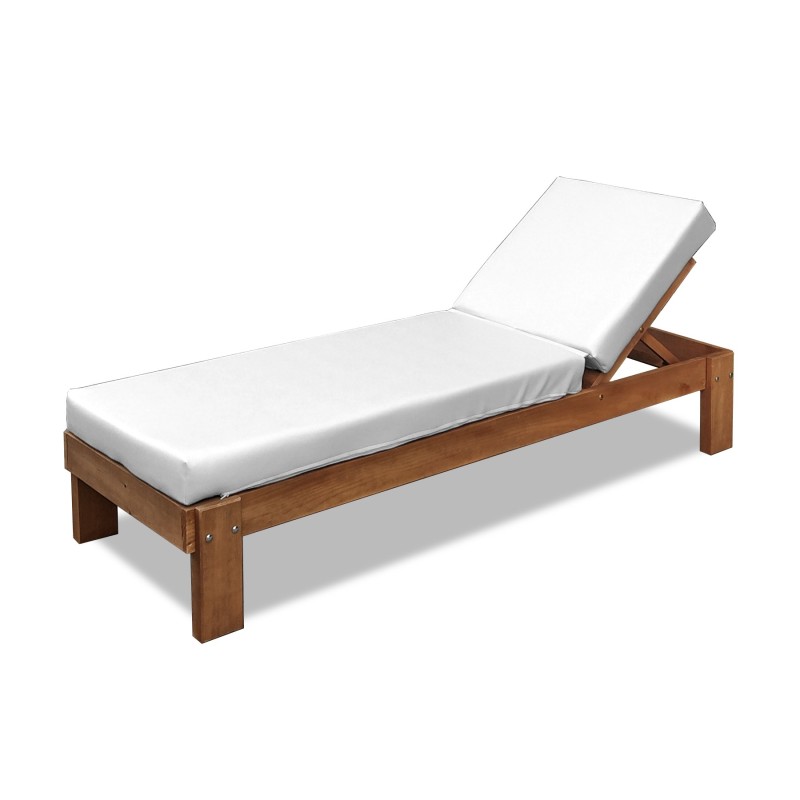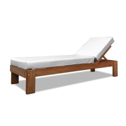 Tumbona fabricada en madera de pino protegido con pintura lasur color nogal resistente a condiciones ambientales exteriores.