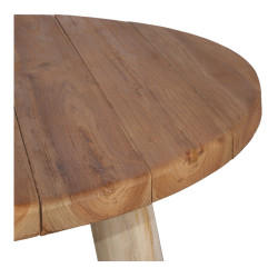 La mesa de comedor Curitiba está totalmente fabricada en madera maciza de teka. Esta mesa adopta un diseño rústico gracias a su acabado artesanal: su estructura, realizada con troncos cuidadosamente trabajados, y su tapa alistonada.