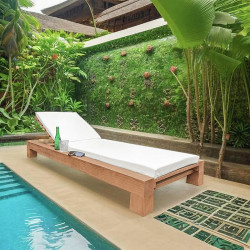 Tumbona de diseño moderno y muy robusto fabricada en madera de pino protegida con tratamiento lasur, los laterales tienen una superficie de 10 cmt de ancho ideales para usar de posavasos o depositar los enseres tales como el smartphone o gafas de sol, colchoneta articulada fabricada en polipiel náutico e ignífugo con espuma de alta densidad resistente a condiciones ambientales exteriores.