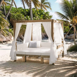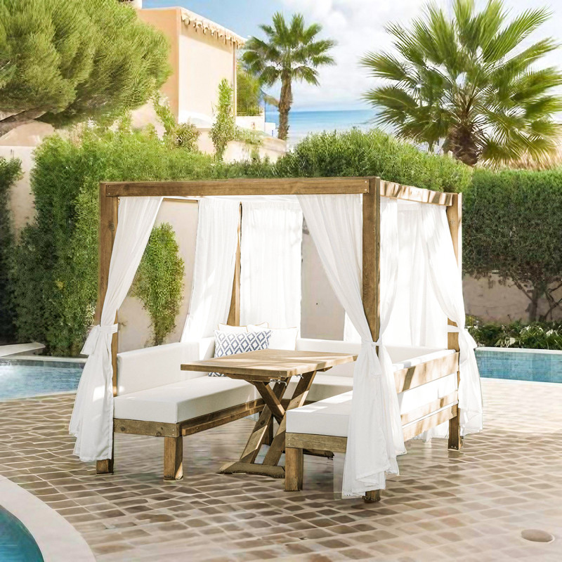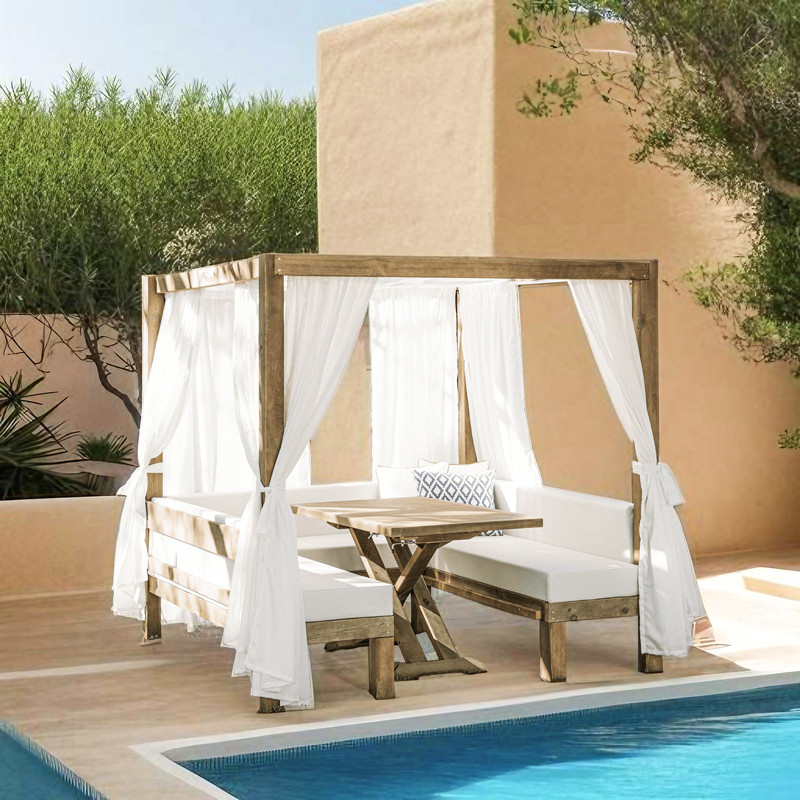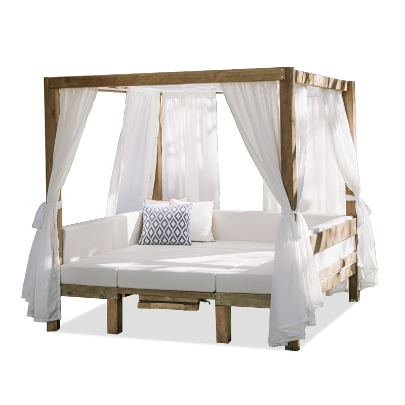 Nuestra cama balinesa convertible es un modelo que nos ofrece la versatilidad de poder disfrutar una balinesa y un velador para poder comer en el exterior con capacidad para 6 comensales.