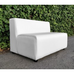 Sillón fabricado en polipiel náutico y espuma de alta densidad, dotado de patas plásticas negras y resistente a condiciones ambientales exteriores.