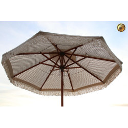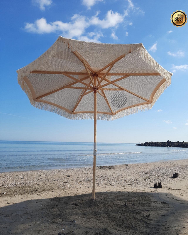 Sombrilla elegante con parasol tejido en macramé, pie y estructura de madera plegable, resistente a condiciones ambientales exteriores para uso particular y profesional