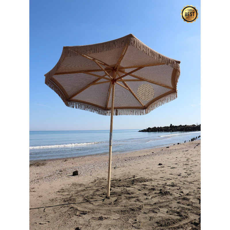 Sombrilla elegante con parasol tejido en macramé, pie y estructura de madera plegable, resistente a condiciones ambientales exteriores para uso particular y profesional
