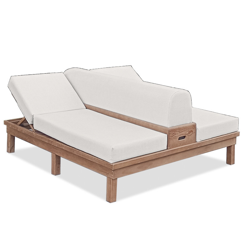 Nuestra tumbona modelo Zambia ha sido diseñada para el disfrute y relax de dos personas simultáneamente pero con total independencia entre ellas, gracias a su separador central con cerradura incluida que puede ser utilizado como mesa o si lo prefiere puede ponerlo con el separador central tapizado para que pueda ser usado como respaldo y convertir su tumbona en sofá.