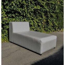 Chaise longue fabricada en polipiel náutico y espuma de alta densidad, dotado de patas plásticas de color negro y resistente a condiciones ambientales exteriores.