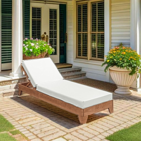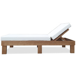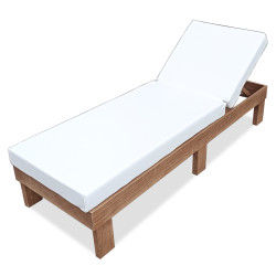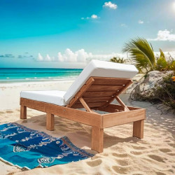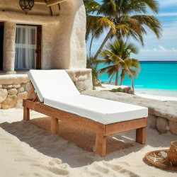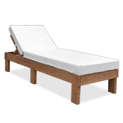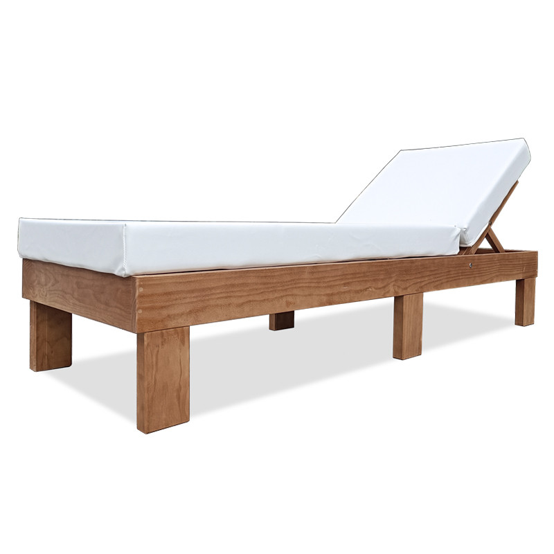 Tumbona muy robusta dotada de seis patas fijas fabricada en madera de pino libre de nudos de alta calidad protegida con tratamiento lasur, colchoneta articulada desenfundable y lavable de polipiel náutico e ignífugo con espuma de alta densidad resistente a condiciones ambientales exteriores.