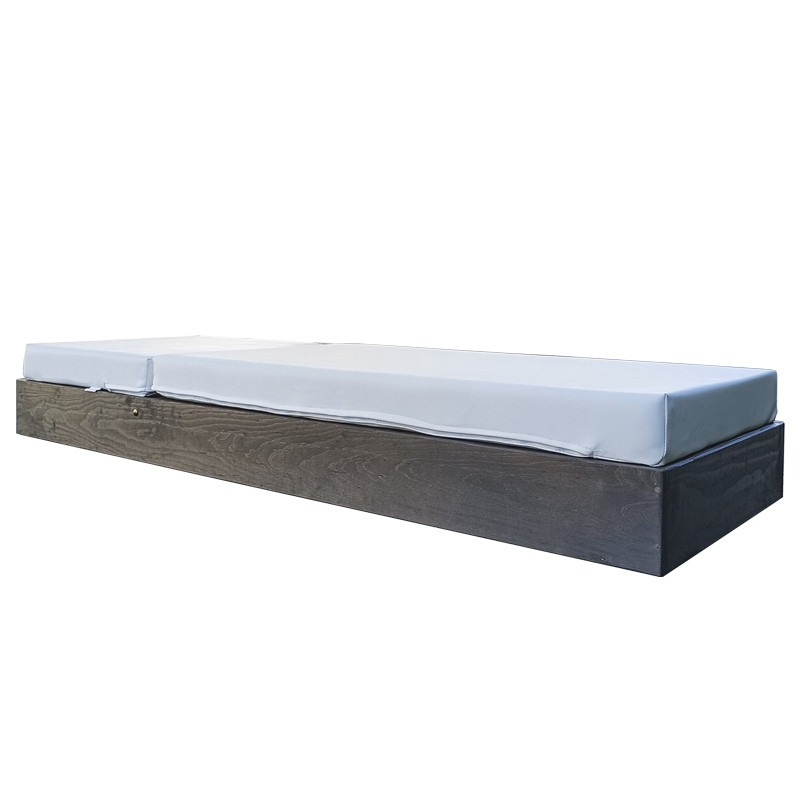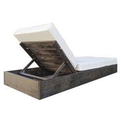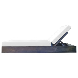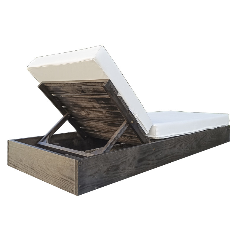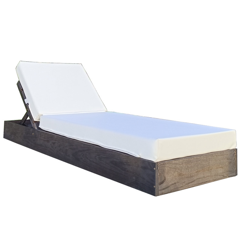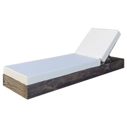 Tumbona para exterior a ras de suelo fabricada en madera de pino protegido con pintura lasur en diferentes colores a elegir, colchoneta articulada de polipiel náutico e ignífugo con espuma de alta densidad resistente a condiciones ambientales exteriores.