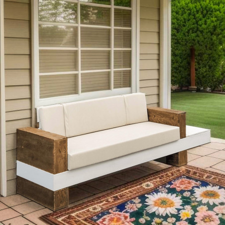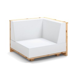 Plateforme d'angle en bois de pin, design moderne et minimaliste adaptée à une utilisation dans le jardin ou la terrasse.