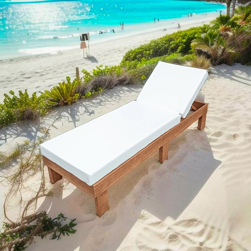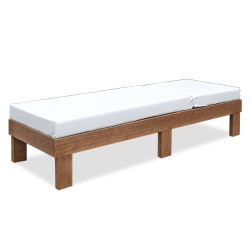 Bain de soleil très robuste équipé de six pieds fixes en bois de pin de haute qualité sans nœuds protégé par traitement lasur, matelas articulé amovible et lavable en simili cuir nautique et ignifuge avec mousse haute densité résistante aux conditions environnementales extérieures.