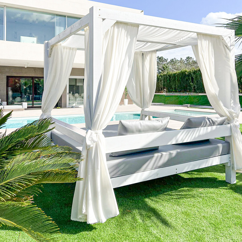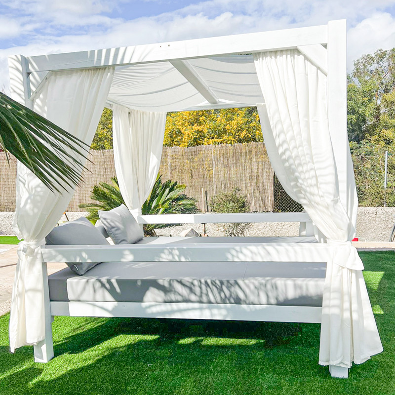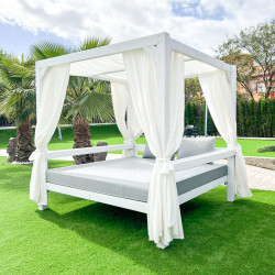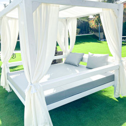 Lit balinais au design sobre et élégant pour un confort maximum, structure robuste équipée de deux sous-verres latéraux pour que vous puissiez profiter de vos boissons préférées, produit fabriqué pour une utilisation en extérieur, valable sur les plages et les jardins