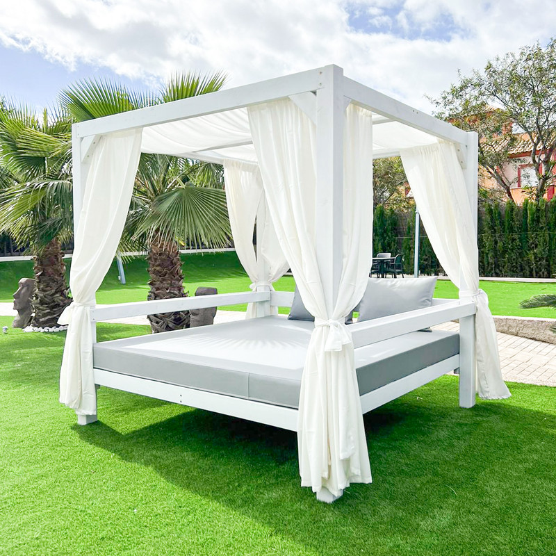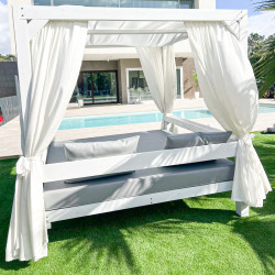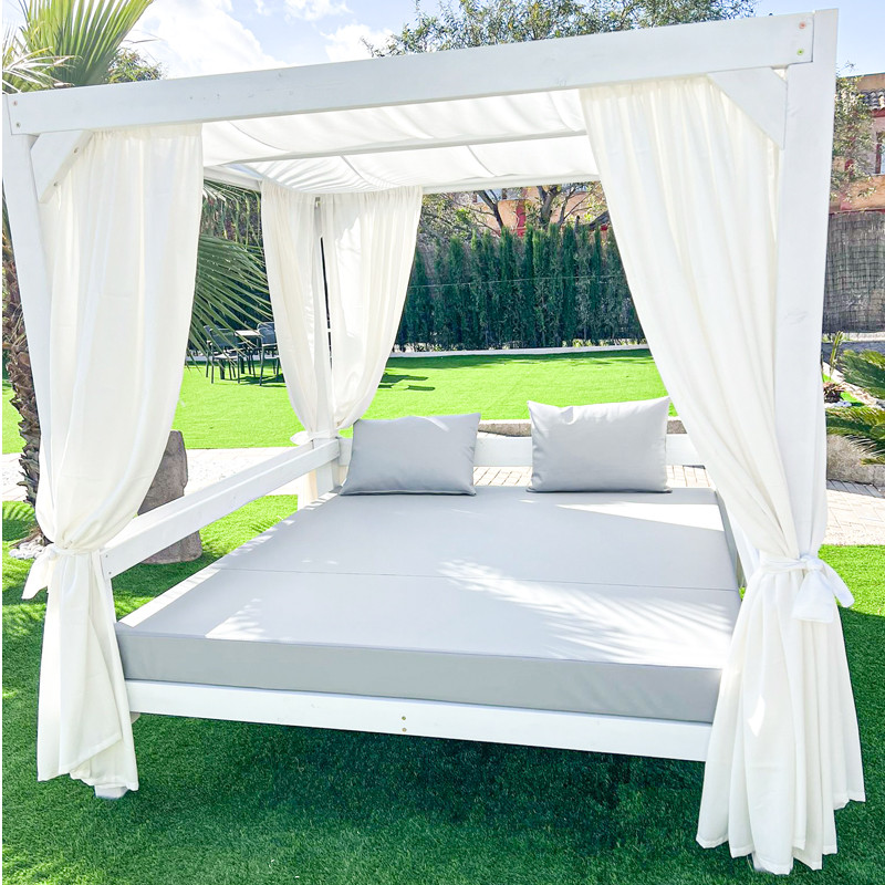 Lit balinais de fabrication nationale, un produit artisanal avec des matériaux très résistants aux conditions environnementales extérieures pour garantir une utilisation prolongée dans le temps.Nous proposons une large gamme de couleurs pour la finition du bois, notamment le noyer, le teck, le sable, le blanc et le wengé.