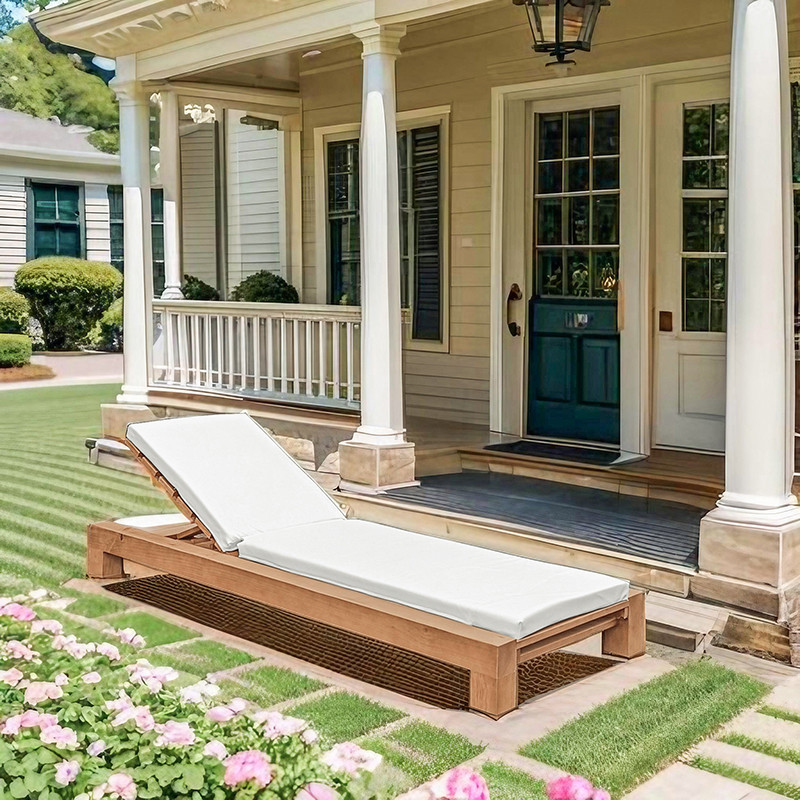 Chaise longue au design moderne et robuste en bois de pin protégé par traitement lasur, les côtés ont une surface de 10 cm de large, idéale pour être utilisée comme dessous de verre ou pour placer des objets tels qu'un smartphone ou des lunettes de soleil, matelas articulé en simili cuir nautique et ignifuge avec mousse haute densité résistante aux conditions environnementales extérieures.