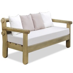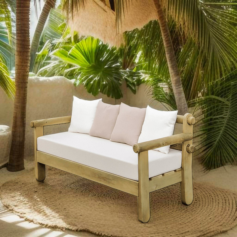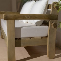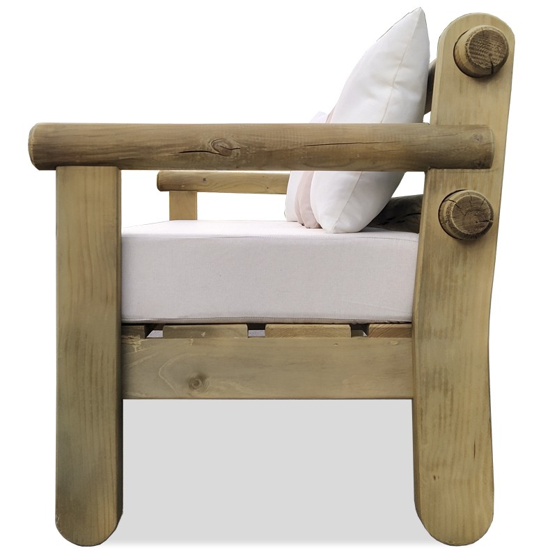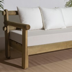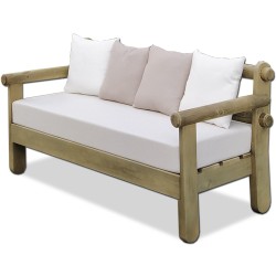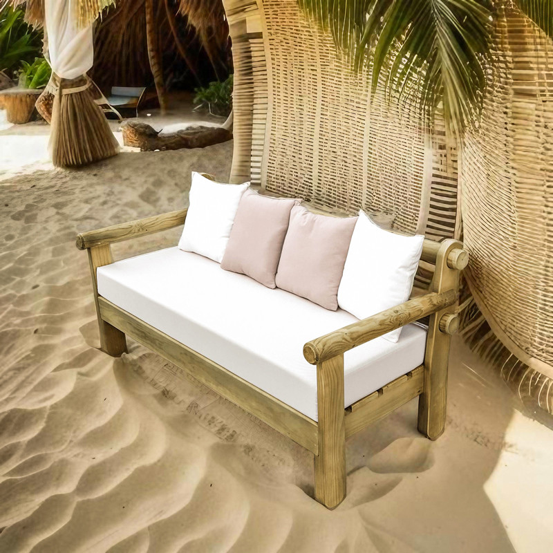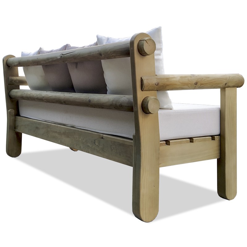 Divano realizzato in legno di pino per utilizzo in ambienti interni ed esterni, braccioli a bastone tondo e schienale con inclinazione ergonomica per un uso prolungato
