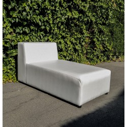 Chaise longue realizzata in similpelle nautica e schiuma ad alta densità, dotata di gambe in plastica nera e resistente alle condizioni ambientali esterne.
