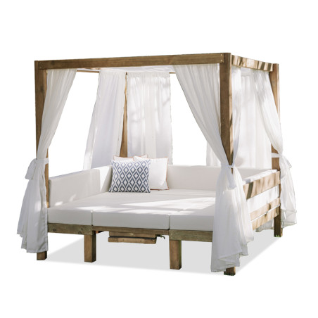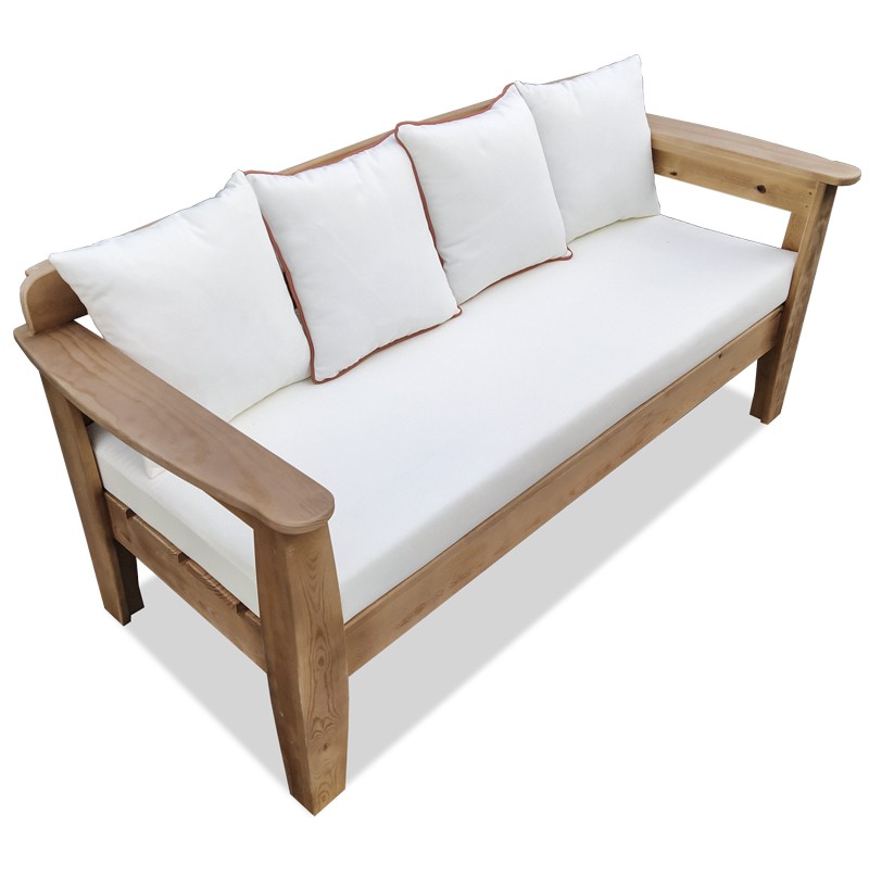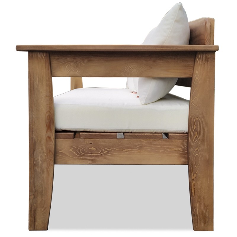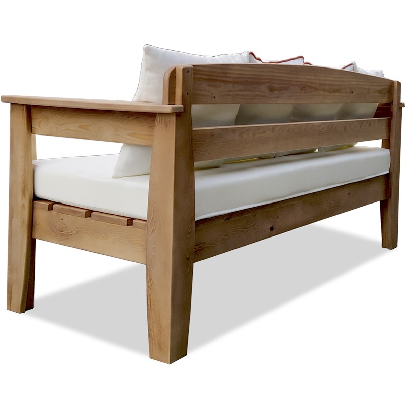 Divano in stile vintage realizzato in legno di pino, modello adatto all'utilizzo in ambienti interni ed esterni, design ergonomico con doppio rinforzo nello schienale e bracciolo curvo