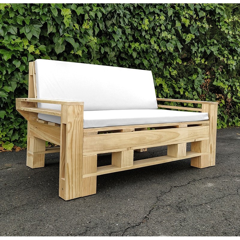 Divano pallet realizzato in legno di pino spazzolato e levigato, schienale inclinato per maggiore comfort e praticità, possibilità di molteplici abbinamenti tra finiture legno e tessili.